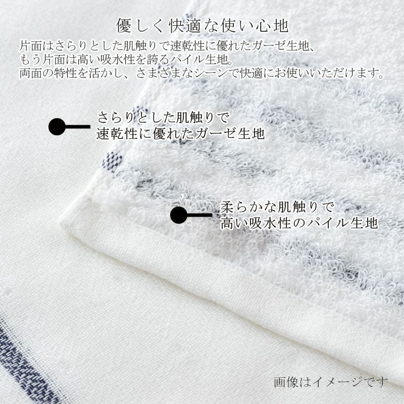 片面はさらりとした肌触りで速乾性に優れたガーゼ生地、もう片面は高い吸水性を誇るパイル生地。両面の特性を活かし、さまざまなシーンで快適にお使いいただけます。