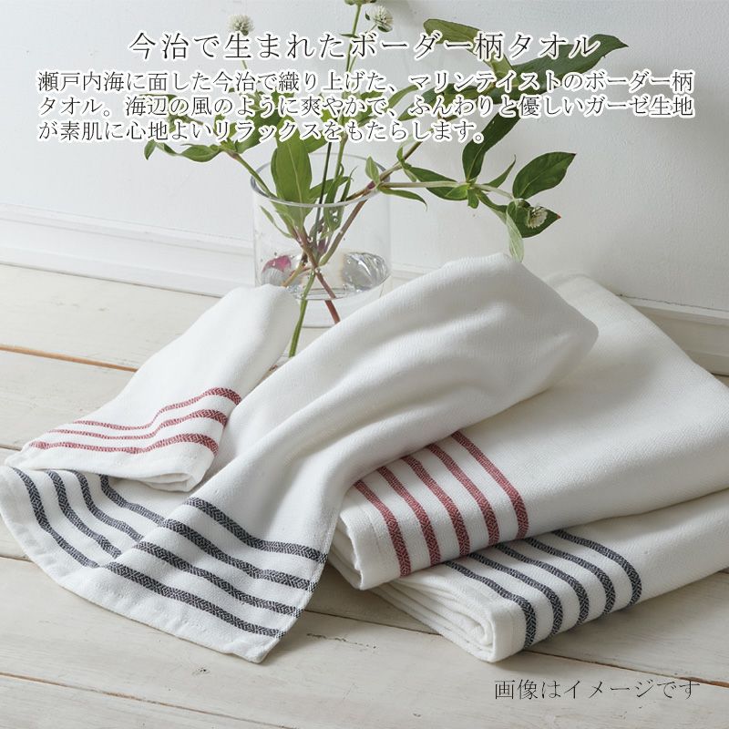 瀬戸内海に面した今治で織り上げた、マリンテイストのボーダー柄タオル。海辺の風のように爽やかで、ふんわりと優しいガーゼ生地が素肌に心地よいリラックスをもたらします。 爽やかなホワイトを基調に、クラシックなボーダー柄をあしらいました。 ギリシャ産の綿を使用した特殊紡績糸「オリンピアコットン」を使用し、柔らかく心地よい肌触りのガーゼパイル生地に仕上げました。