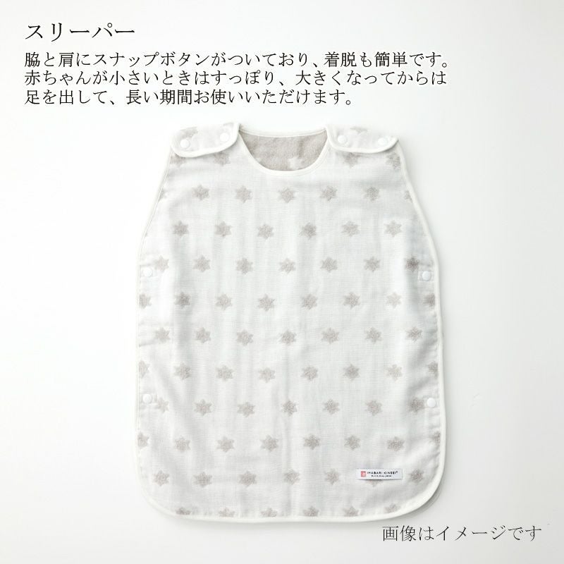 スリーパーの裾が開いているので使用できる期間も長いガーゼのベビーアイテムです。スナップ使いもうれしいポイント♪