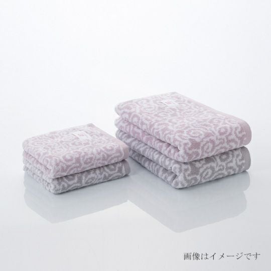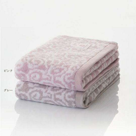 日本古来の唐草文様と来島海峡の荒波を連想させる波文様を今治タオルの特徴ともいえる、織柄で表しています。美しい織柄を引き立てる落着いたピンクとグレーの色はインテリアシーンに馴染むように考えらえた美しい組み合わせでセットでお使いいただくこともおすすめです。