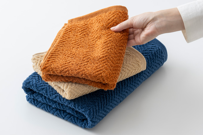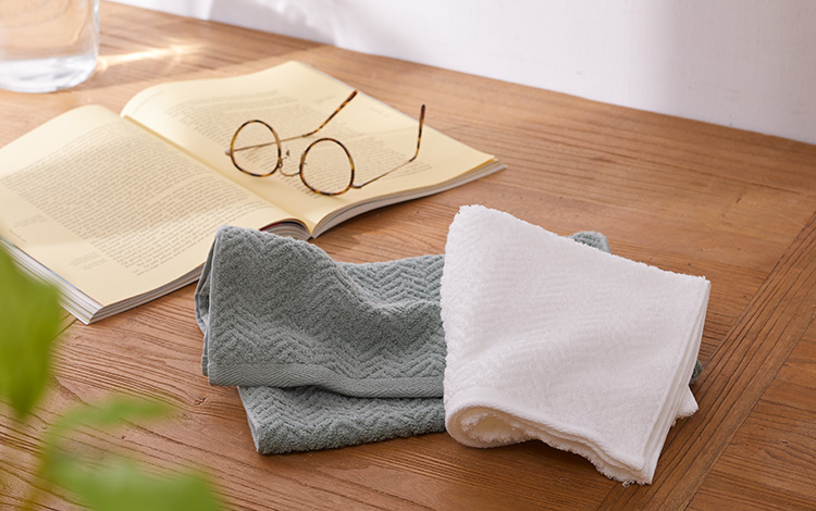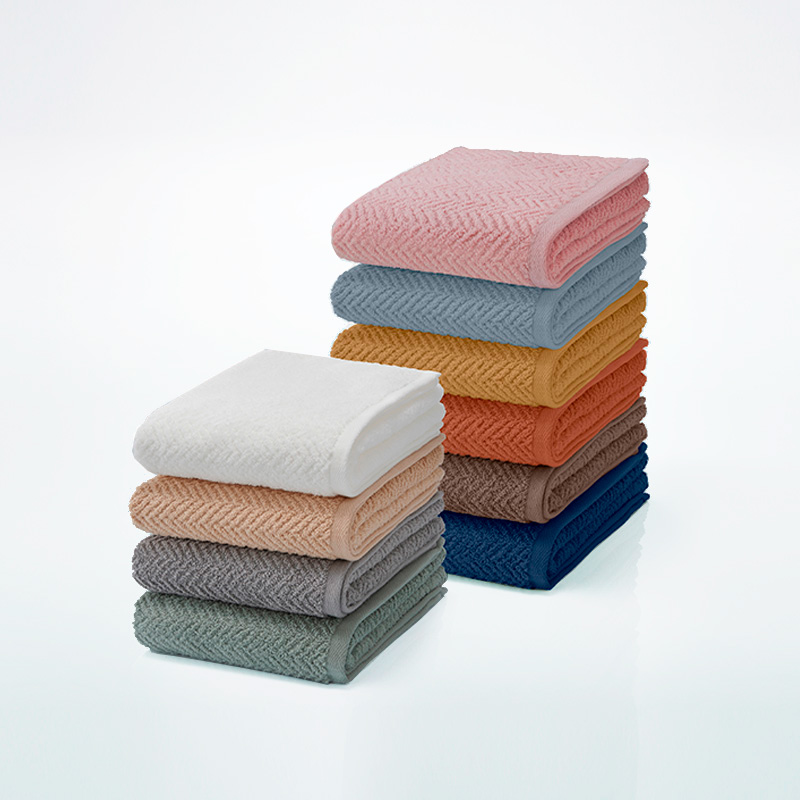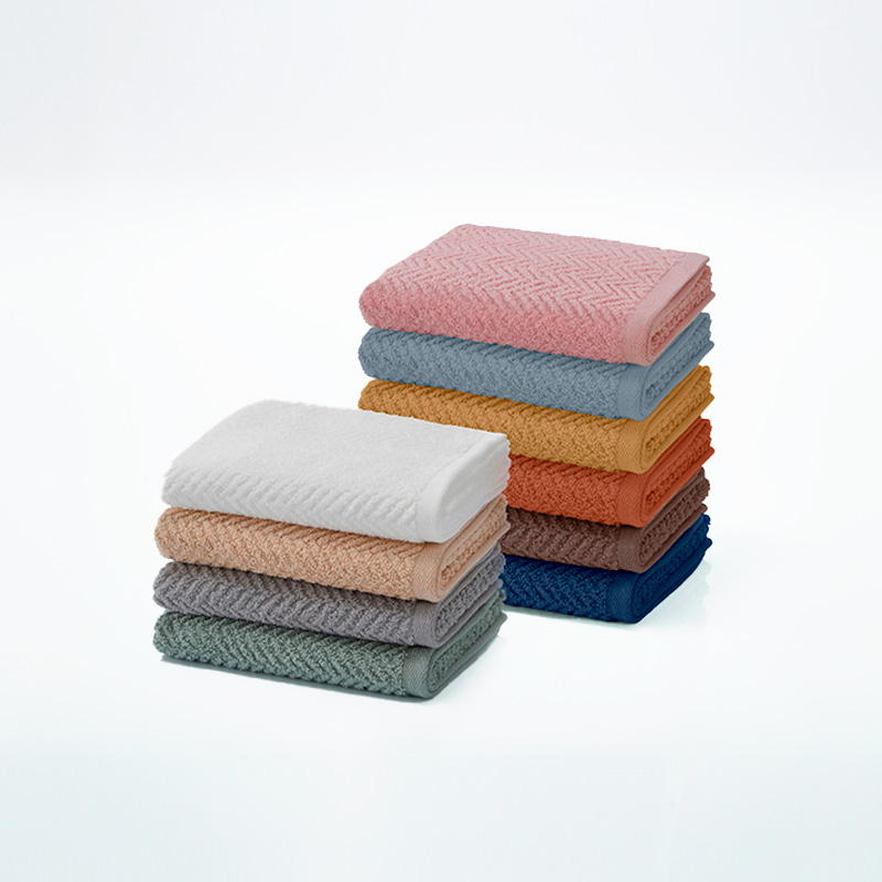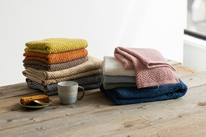 立体的なあぜ織りのヘリンボーン織の今治タオル。適度なボリューム感と軽やかさを両立しました。毎日使うのに丁度良いバランスのタオルに。