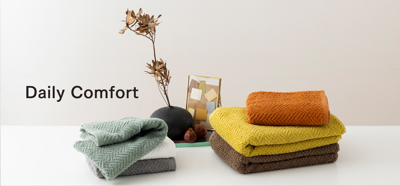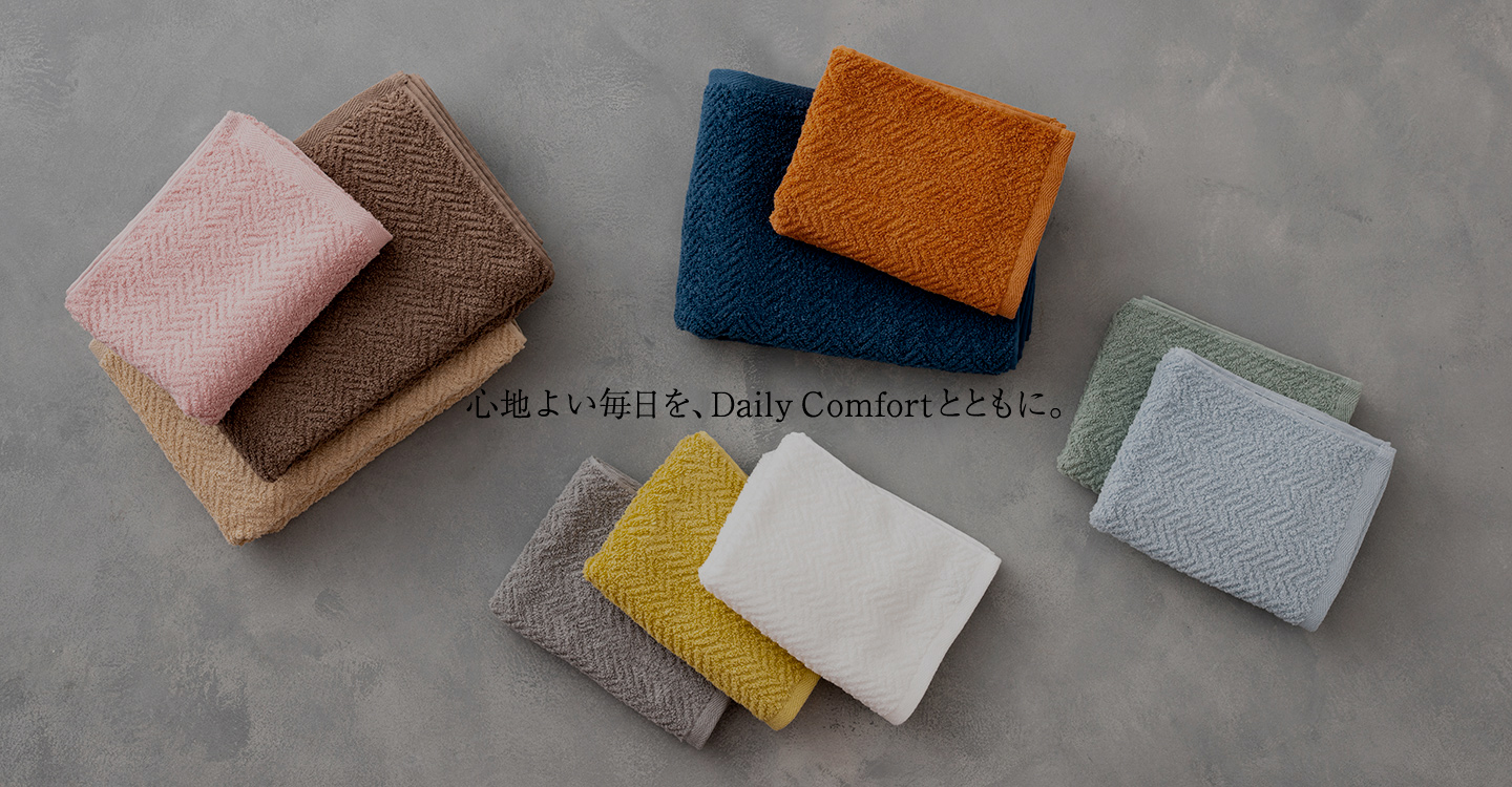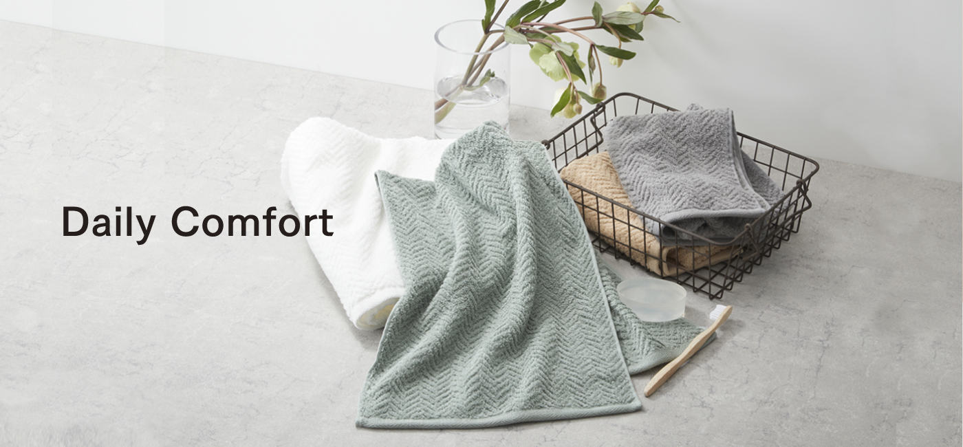 シンプルで洗練されたデサインも魅力のDaily Comfort(デイリーコンフォート)。触れるたびに感じる、ふわっと柔らかな上質なタオルが水分を吸い取り、毎日のくらしを格上げします。