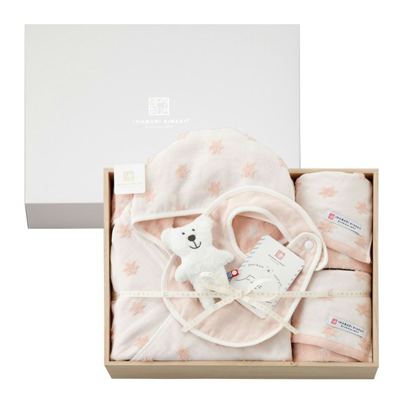 今治謹製 First towel 木箱入り フード付きバスポンチョ1枚・フェイスタオル2枚・スタイ1枚・にぎにぎ(鈴入り)1点セット FS7713 ピンク (今治産)