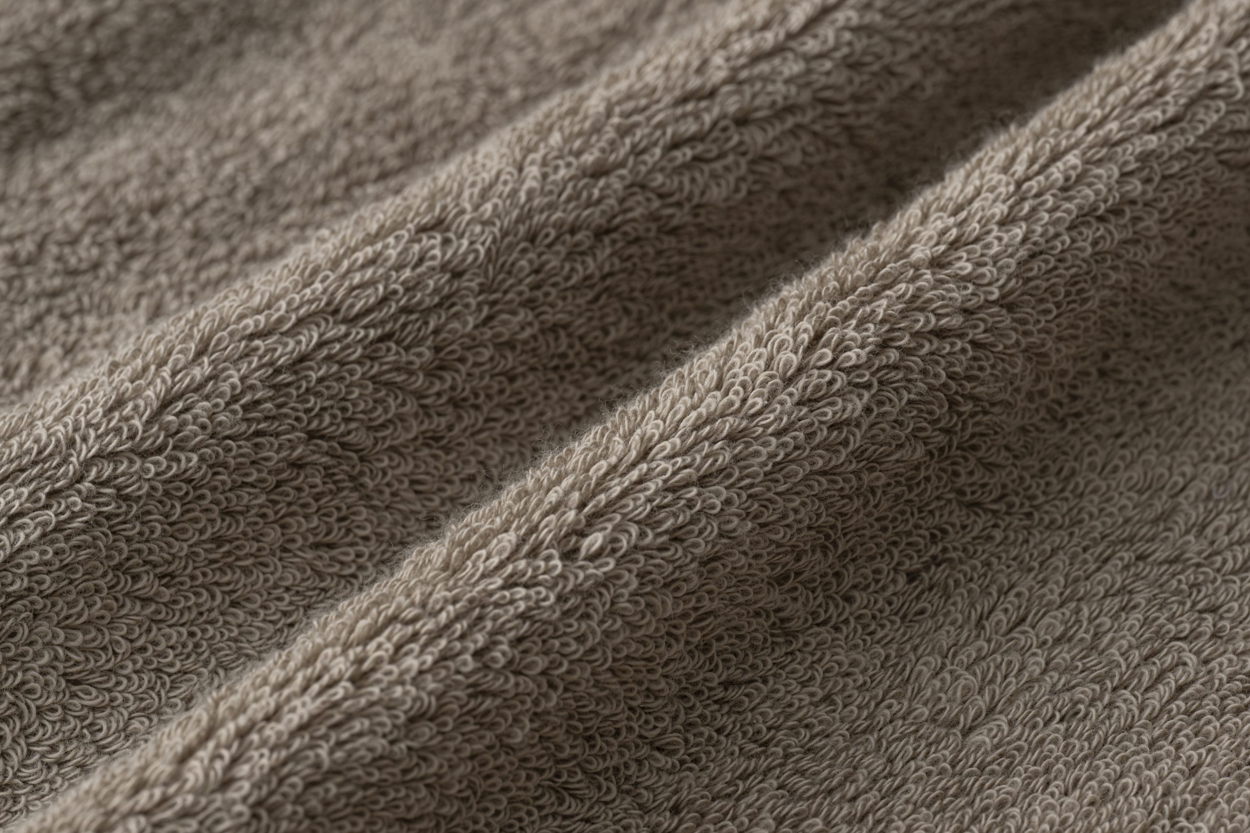 その綿は油分を多く含んでいるため、しなやかなドレープ性があり、また綿の繊維が細いため、艶やかな光沢があります。そのしっとり柔らかい綿を甘撚りに紡ぎ、極上の肌ざわりのバスローブを生み出します。