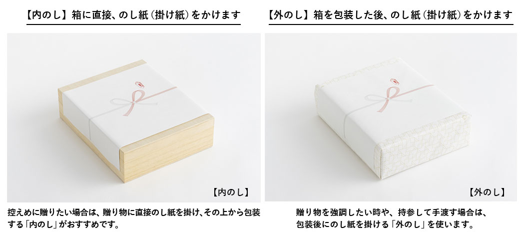 「内祝い」は現在では「返礼品」と捉えられていますが、もともとは「自分に祝い事があったのでお裾分けします」という意味があり、相手の慶事をお祝いする贈り物ではありません。このことから、控えめな表現に感じる「内のし」が内祝いにはおすすめです。 宅配便で贈り物を贈る際には、配送途中でのし紙が傷つかないように「内のし」がよいとされています。 「外のし」は贈り物をお渡しする際、どのような気持ちでお贈りしているのかを表す「表書き」が先様にはっきりと見えます。先様に贈った目的が即座に伝わるため、結婚・出産祝いなどは「外のし」が適切といえます。
