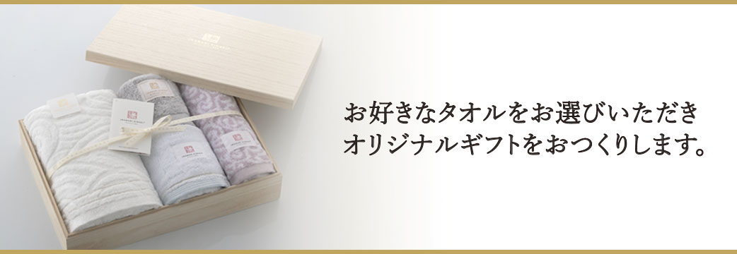 店頭で販売しているタオルの中からお好きな今治タオルをお選びいただき木箱もしくは紙箱にお詰めし、オリジナルギフトをオーダーいただけます。タオルソムリエやギフトアドバイザー等の経験豊富なスタッフが丁寧にご相談を承ります。タオル選びや、ギフトの習慣、金額の相場、のしのご相談等お気軽にお問い合わせください。