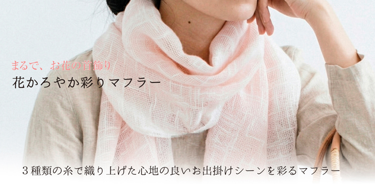 この度、公式オンラインショップにて、色彩と奥行きを持たせた、まるでお花の首飾りのようなかろやかなマフラー「花かろやか彩りマフラー」を販売開始いたしました。