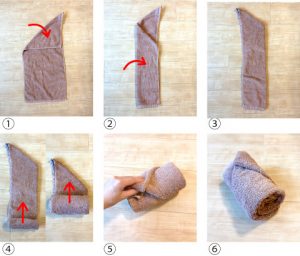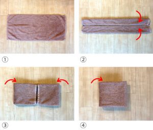 ※タオルのサイズによって折る幅を調整してください。バスタオルの場合は、三つ折りにするとバランスよく見えます。