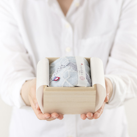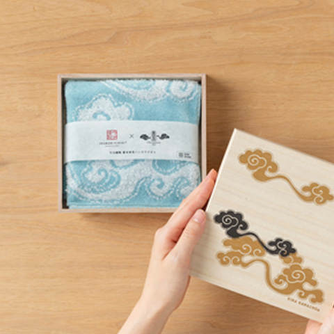 模様刺しをモチーフにした今治タオルのハンカチには、ご縁が長く続きますようにとの願いが込められています。シンプルながらも華やかな贈り物になるよう、シルバーの箔をあしらった木箱にお詰めし、上品な印象に仕上げました。