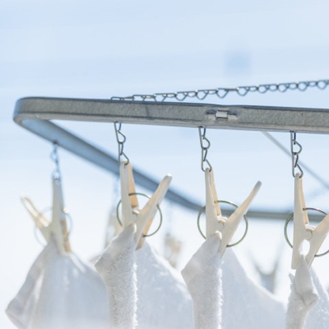 強い日差しに当てすぎると繊維が硬くなりやすいため、なるべく風通しのよい日陰で干すことをおすすめします。