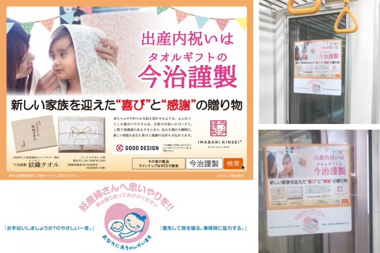 妊婦さんにやさしい環境づくりを推進するマタニティマークを応援する為、2017年4月3日より、都営浅草線・三田線の車両広告を開始しています。この度、デザインを新しくし、 優先席付近に掲載中です。
